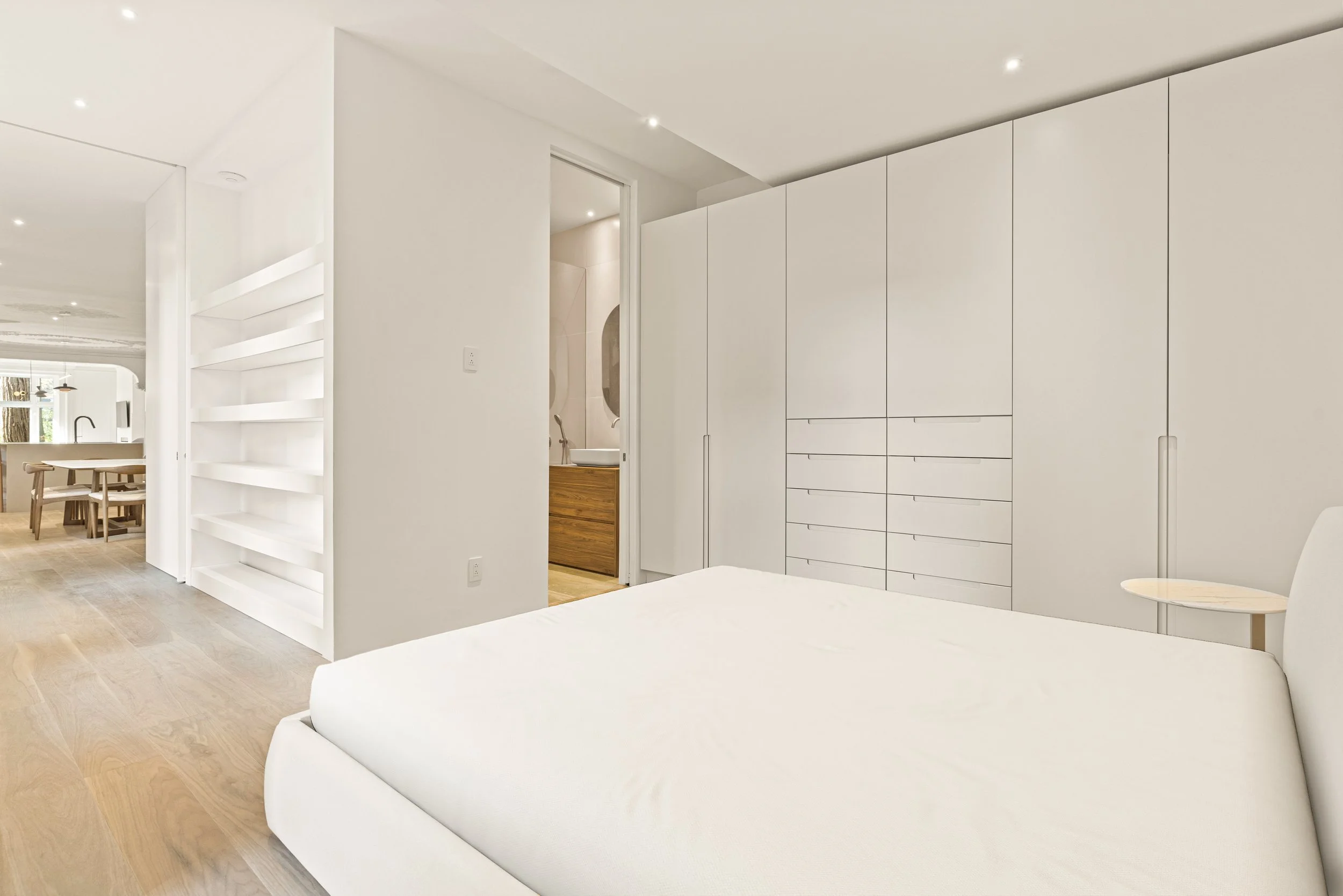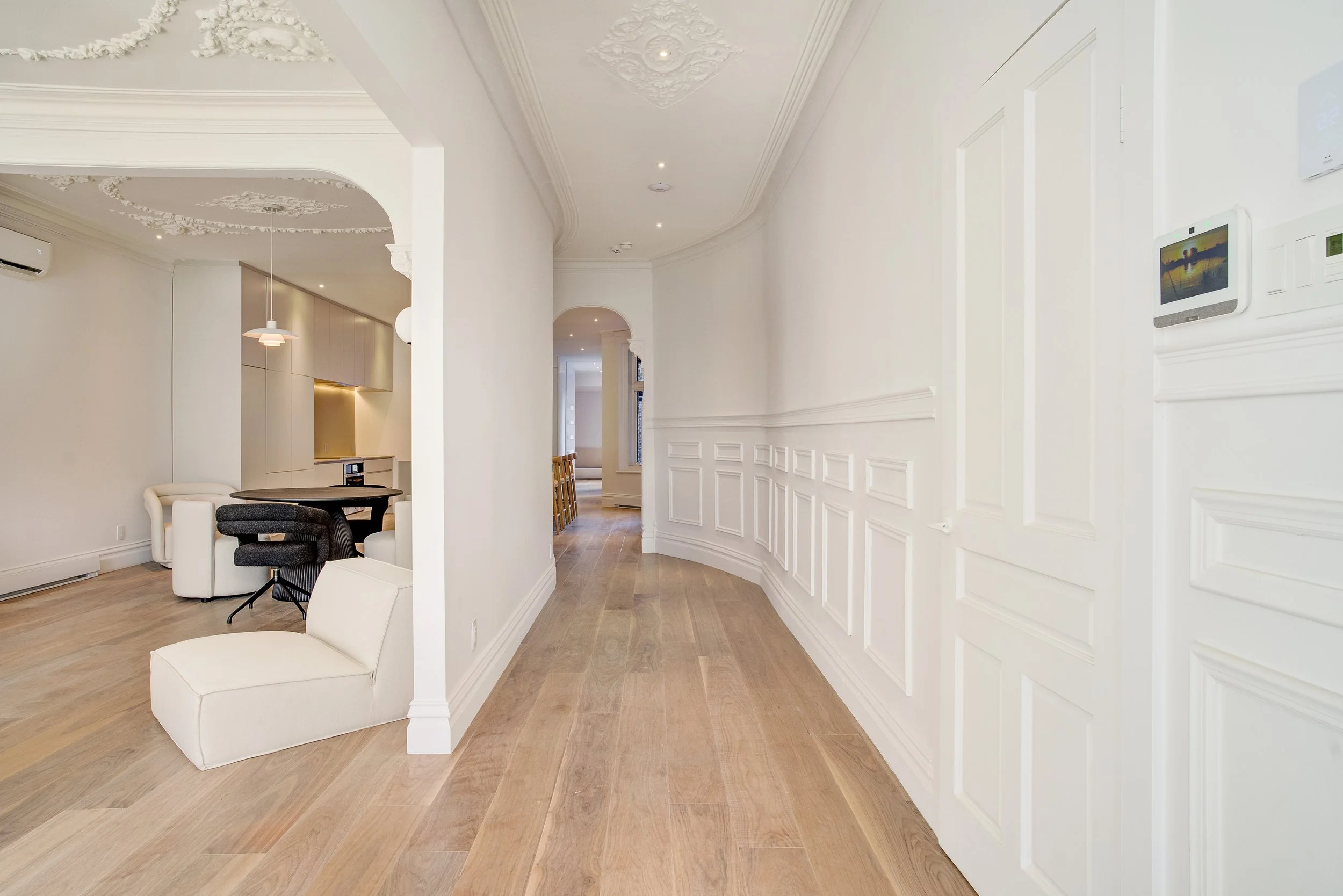 Nous avons mis en valeur les moulures, les ornements et les éléments historiques du bâtiment tout en intégrant une touche de modernité, créant ainsi une belle fluidité entre tradition et design actuel.